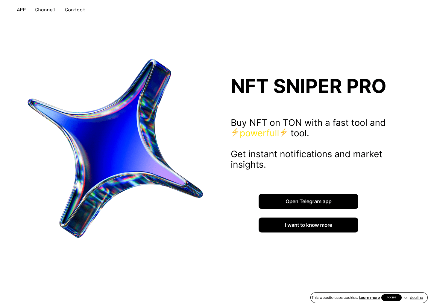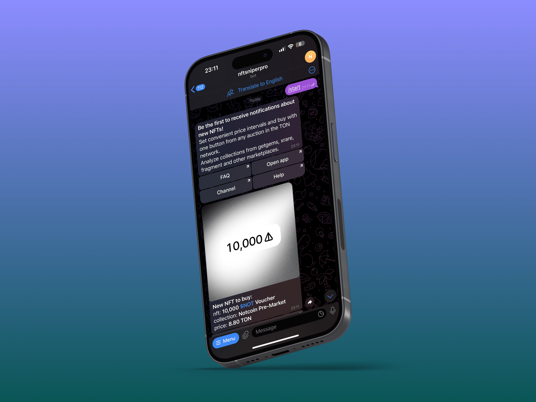 Introducing the NFT Sniper Bot and Mini App for TON NFT Marketplaces, the ultimate tools for NFT enthusiasts and collectors on the Telegram platform. Designed to enhance your NFT trading experience, these tools provide real-time notifications, advanced analytics, and seamless transactions, ensuring you never miss an opportunity in the fast-paced world of TON NFTs.